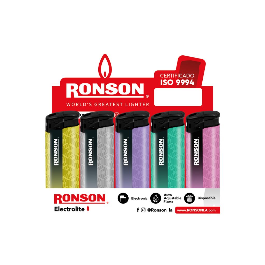 Los encendedores Ronson llevan más de 100 años en el mercado. Cuentan con certificación ISO 9994 y CESMEC lo que los convierte en productos seguros y confiables. JET FLAME SOLIDDISPLAY 15 UNIDADES EMBALAJE 900 UNIDADES ELECTRONICO LLAMA REGULABLE RECARGABLE ANTIVIENTO Leer másJET FLAME MOTIVOSDISPLAY 15 UNIDADES EMBALAJE 900 UNIDADES ELECTRONICO LLAMA REGULABLE RECARGABLE ANTIVIENTO Leer más2.0DISPLAY 15 UNIDADES EMBALAJE 900 UNIDADES ELECTRONICO LLAMA AUTOREGULABLE Leer másMINI ELECTROLITEDISPLAY 15 UNIDADES EMBALAJE 900 UNIDADES ELECTRONICO LLAMA REGULABLE Leer másELECTROLITE SOLIDDISPLAY 15 UNIDADES EMBALAJE 900 UNIDADES ELECTRONICO RECARGABLE Leer más